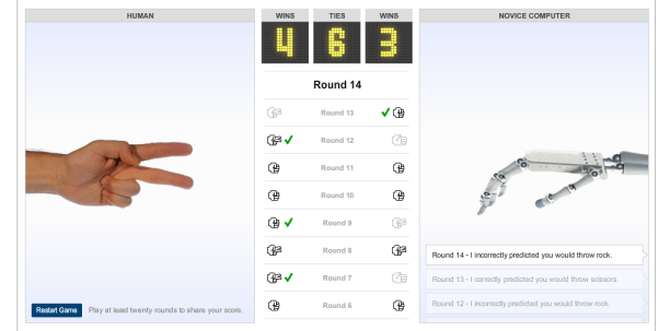 L’intelligenza artificiale è una delle tematiche più affascinanti che trattiamo in postumano.com. Qualche giorno fa il sito del New York Times ha pubblicato una simpatica dimostrazione delle potenzialità di una I.A. basica, in grado di imparare il tuo stile di gioco a morra cinese osservando le mosse umane. Calcolando le medie statistiche e usando semplici regole il computer riesce a migliorare velocemente il proprio punteggio, diventando un avversario difficile.