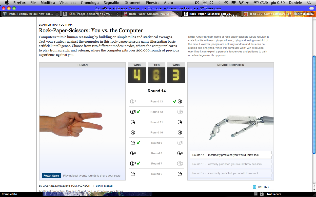 E’ una prova molto divertente di come un semplice algoritmo riesca a simulare e sorpassare il pensiero umano. Sono rimasto sorpreso dal numero di volte in cui abbiamo pensato la stessa mossa e di come (dopo diversi round) l’ I.A. sia riuscita a capire la mia strategia, anche quando ho provato a giocare d’istinto. Evidentemente ci sono dei mecccanismi “umani” che fanno risultare prevedibile la nostra prossima scelta.